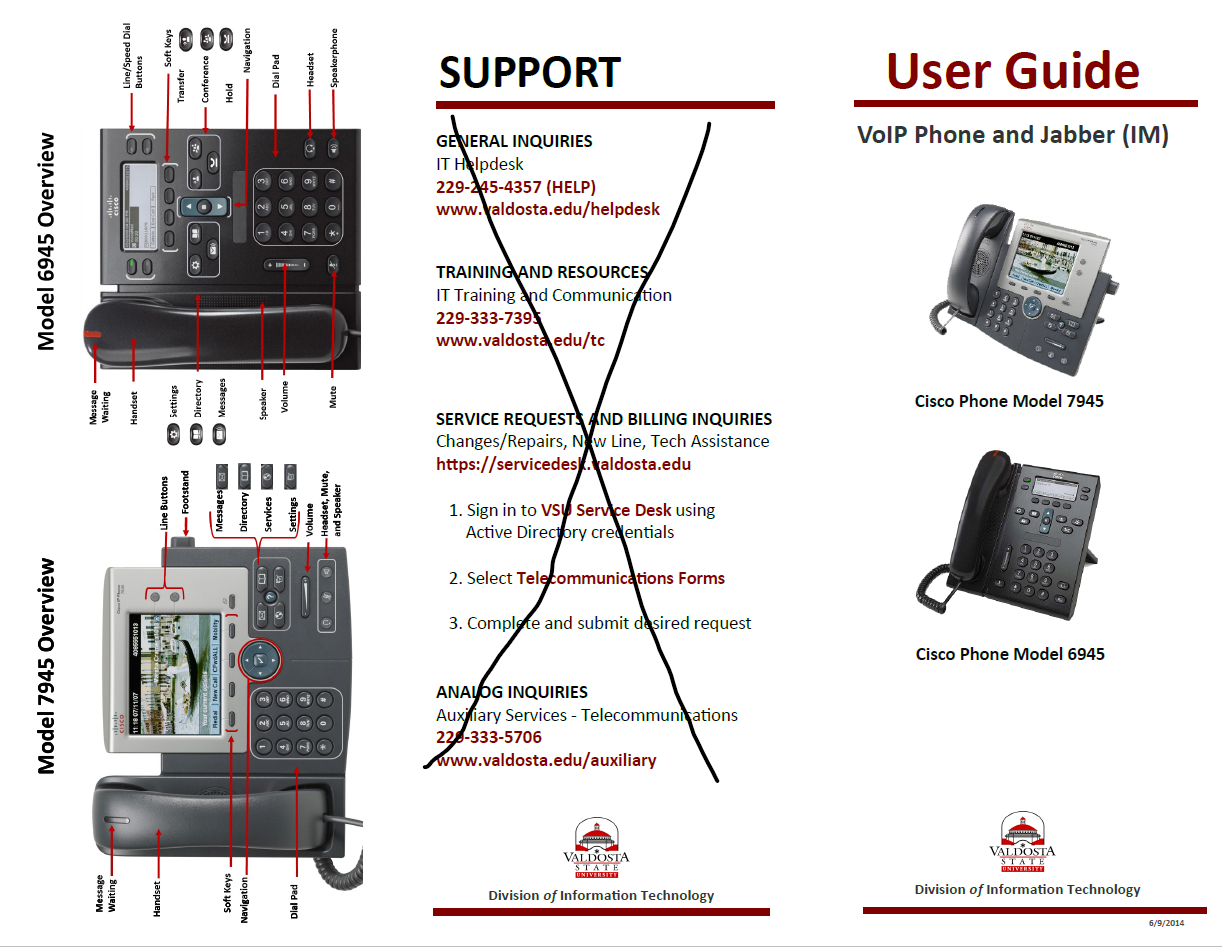Currently VSU uses VoIP telephones (Voice over Internet Protocol) that use the internet, instead of a telephone network, to transmit voice communication. There are a few different models available but they all have similar functions such as being able to transfer and forward calls, speed dial, and set up voicemail. Additionally, Cisco Jabber, the instant messaging chat app, is integreated into the phone system.
