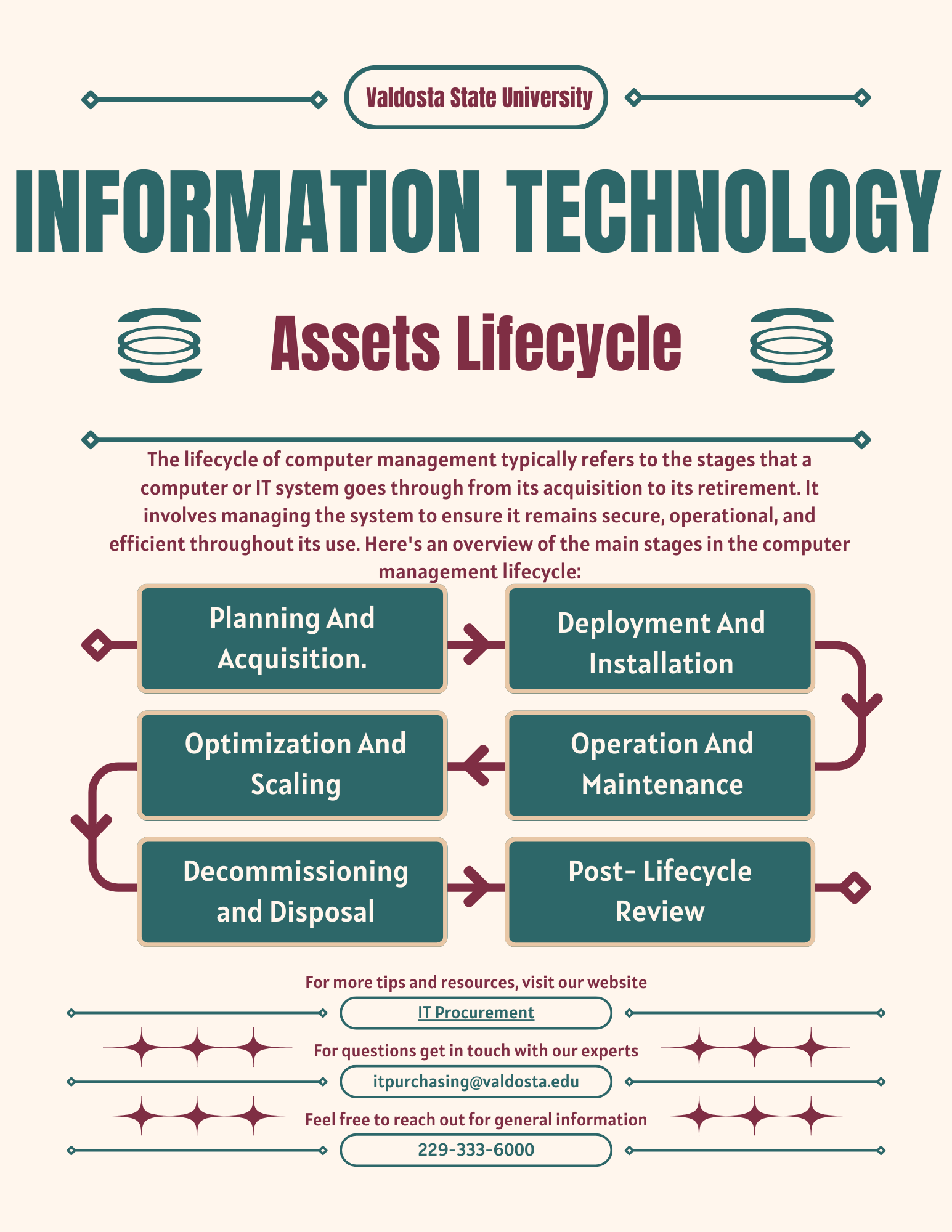 The lifecycle of computer management typically refers to the stages that a computer or IT system goes through from its acquisition to its retirement. It involves managing the system to ensure it remains secure, operational, and efficient throughout its use. Throughout these stages, the goal is to ensure that the system is well-maintained, secure, and optimized, while also managing costs and adhering to regulations.