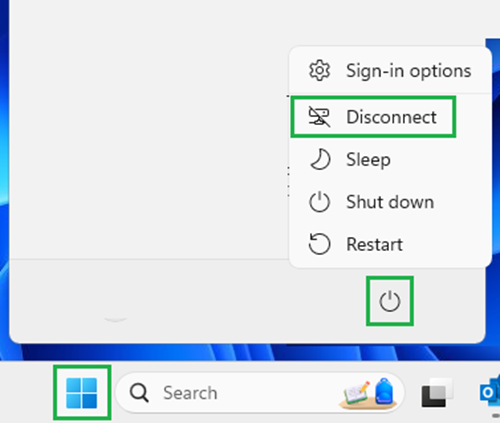 - When you are finished, click the Windows logo on the bottom-left corner of your desktop > click the Power icon > select Disconnect from the pop-up menu.