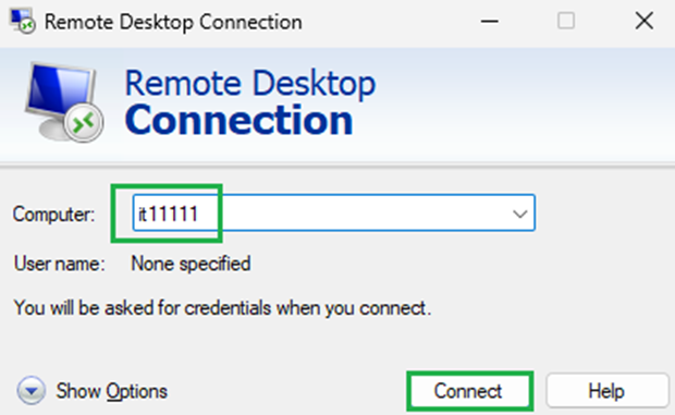 - In the window that appears, type your office computer’s IT Tag Number (the letters "it" followed by a 5-digit number) into the Computer field. Then, click the Connect button.